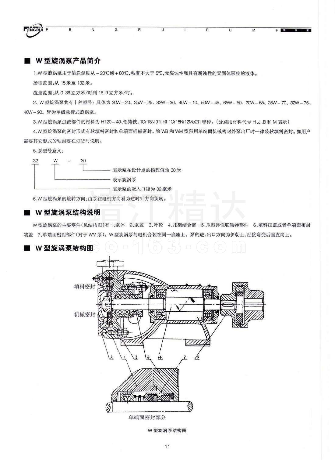 WB 型旋涡泵过流部分的材料为 HT20-40 、铝铸铁和 1Cr18Ni9Ti 、 1Cr18Ni12MoTi 四种(分别用材料代号 H 、 J 、 B 和 M 表示)。