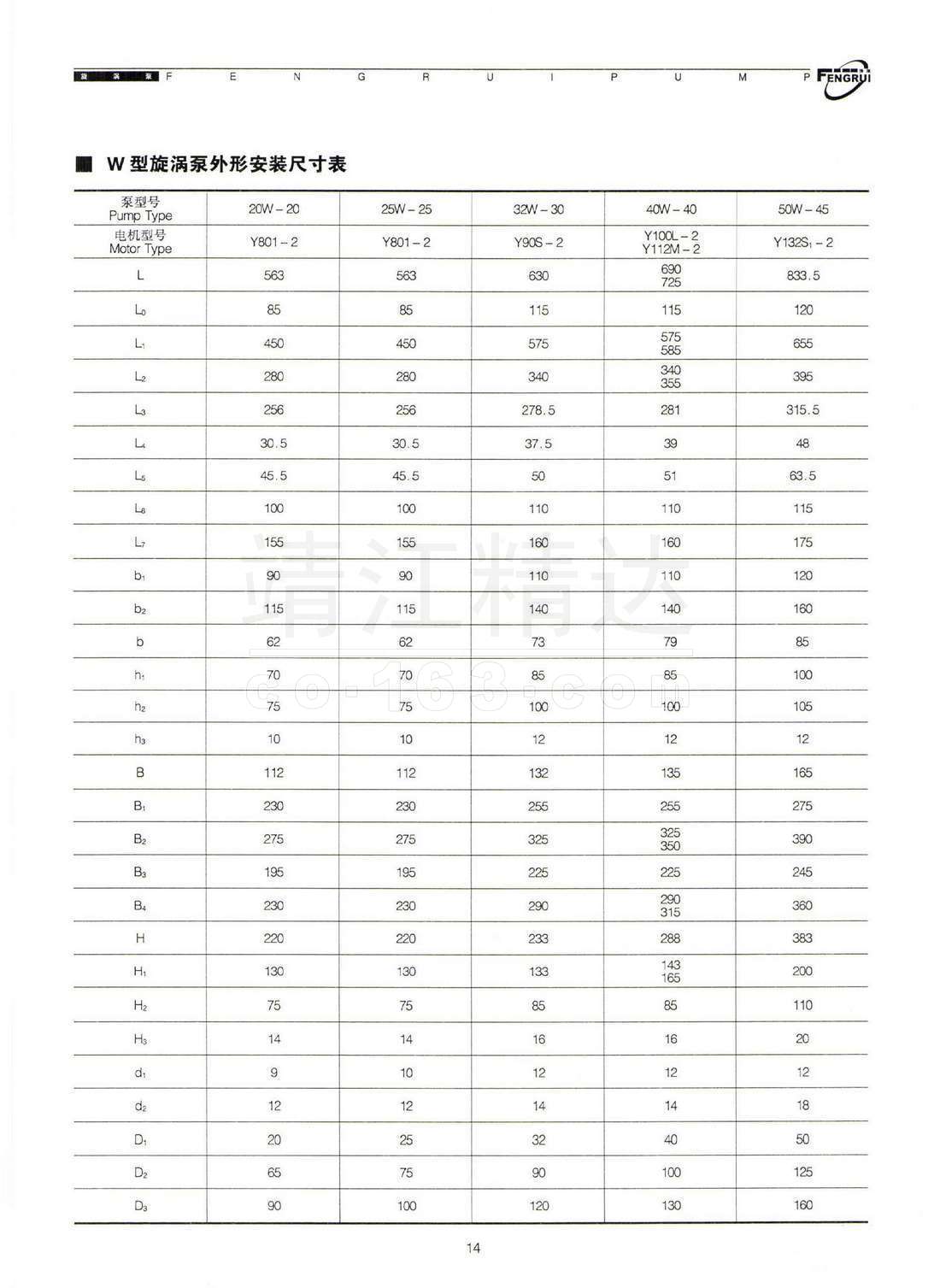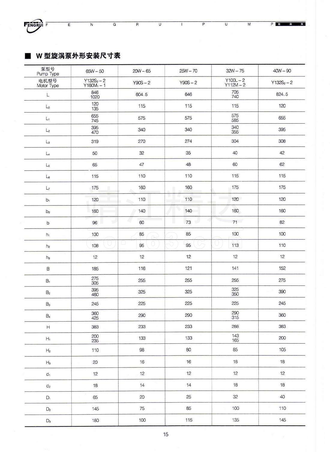 WB 型旋涡泵共有十种型号 : 具体为 20WB-20 、 25WB-25 、 32WB-30 、 40WB-40 、 50WB-45 、 65WB-50 、 20WB-65 、 25WB-70 、 32WB-75 、 40WB-90 。皆为单级悬臂式旋涡泵。